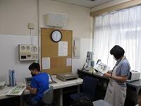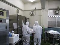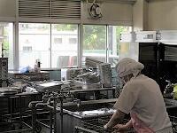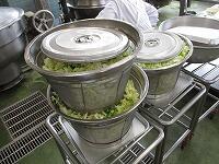 今日は、給食室内の衛生面や安全面等を確認するために、給食室の中に入りました。給食室では、調理員さんが、黙々と集中して調理をしていました。先週は気温が高く、給食室内も大変でした。今日の献立は、「タコライス」と「白菜と春雨スープ」、「よもぎだんご」です。