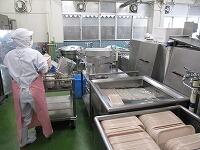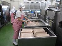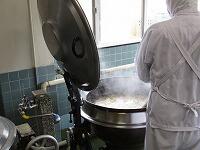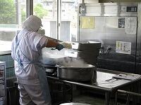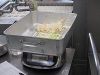 「白菜と春雨のスープ」を作っています。炊けたご飯を重さを量りながら分けています。