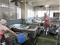 給食後の後片付けの様子です。ワゴンに戻された食器類をまとめて洗っていきます。