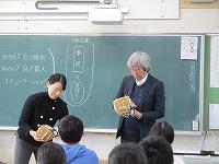 菊池先生と握手をして喜んでいます。菊池先生が、「大谷グローブ」を取り出しました。「メジャーリーグのドジャースの大谷選手は、何で全国の2万校の小学校にグローブを3つずつ、贈ったんですかね?」「大谷選手は、何を伝えたかったんですかね?」
