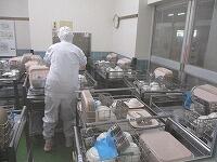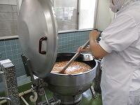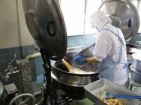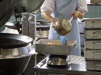 炊きあがったご飯とキムチを炒めたら、完成です。重さを量りながら食缶に分けていきます。