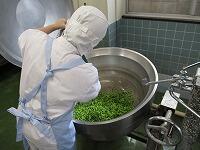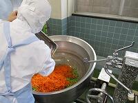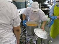 「トマトと卵のスープ」を作っています。途中、栄養士の山南先生が味見をしています。
