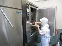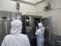 卵を一つ一つ割って、まとめています。食器の消毒保管庫です。ワゴン上のお皿の数などの確認をしています。