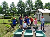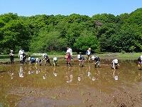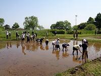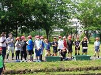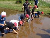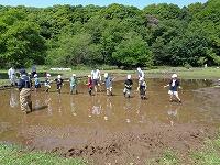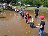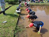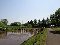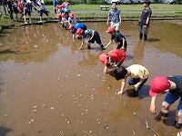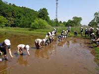 作業を終えて、足を洗います。子どもたちに感想を聞いてみると、「楽しかった。」ということが真っ先に返ってきました。最後に、「公園緑地課」の方が、「今日は、米作りのスタートです。これから、稲がどんどん大きくなっていきます。休みの日とかに公園に来て、自分の植えた苗の育ち具合を観察しに来てください。稲刈りもします。」と話されました。
