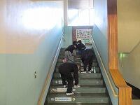 昼の放送でお知らせする、清掃目標の発表の分担をした後、みんなが気持ちよく利用できるように、階段の掃除を行っていました。