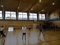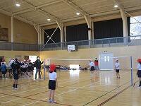 バドミントンのコートを縦半分に分けて、それぞれ1対1の試合を行っていました。