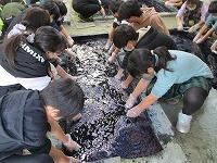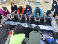 いよいよ、「藍染体験」の開始です。2分ほど、染液を「ハンカチ」に染み込ませます。