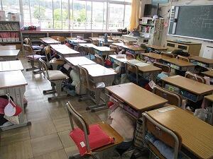 1年生の様子です。頭をしっかりと守っています。今回、鳴るはずの「緊急地震速報」のチャイム音が、鳴りませんでしたが、「訓練!訓練!」の放送の合図で、「第1次避難」、「シェイクアウト」を行うことはできました。今回の訓練は、休み時間の実施だったので、教室だけではなく、廊下や階段、校庭などいろいろなところにいて、「自分で身を守る行動」をとりました。