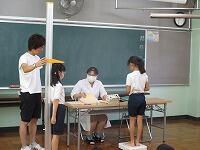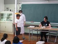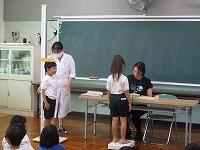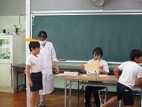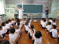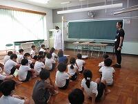 養護教諭の相澤先生が、「水筒は持ってきていますか? ハンカチのほかに、汗拭きタオルも用意してください。」と子どもたちに話しました。