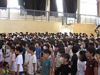 まず、はじめに青木校長先生は、「皆さんにとってどんな1学期でしたか。」と「頑張る目標を立てて、取り組むことはできましたか。」そして、4月の始業式の時にお願いした「3つの約束」について話をしました。さらに、「明日から、長い夏休みに入ります。夏休みは自分の知らないことを調べるチャンスでもあります。ぜひ、身近なことについて調べてみてください。夏休みが終わった後に、『こんなことを調べたよ!』といった報告を楽しみにしています。」と子どもたちに話しました。