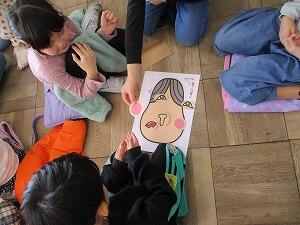 1年生が、生活科の「お正月遊び」で『福笑い』を行いました。『福笑い』は、目かくしをされた人が、目や鼻、口などの顔の一部を、自分の勘を頼りに正しく並べていく遊びです。お正月の伝統的な遊びです。「思うようにできなくて、難しかったです。」でも、それをみんなで楽しみました。「おもしろかったです。また、みんなで遊びたいです。」