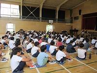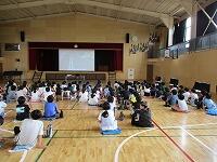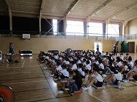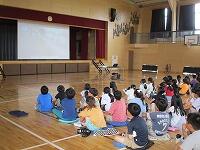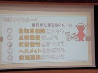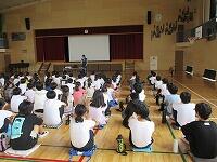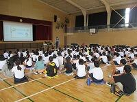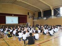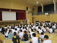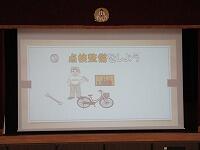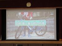 高学年は、しっかりとした姿勢で話を聞いています。「皆さんは、自転車に乗る前に点検をしていますか?」