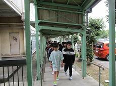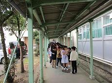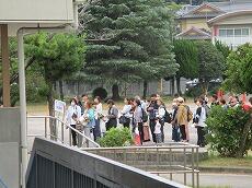 保護者の入場が始まりました。外には、たくさんの保護者の方が並んでいます。渡り廊下では、発表一番手の3年生が待機しています。