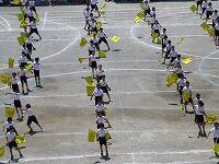 上手に足のステップを踏んでいます。朝礼台の上では、6年担任の中村先生が軽やかにステップを踏んでいます。
