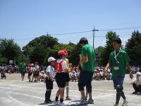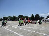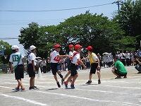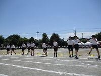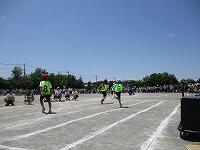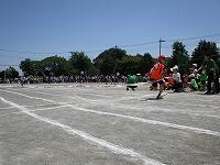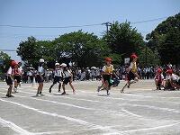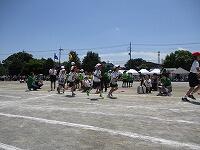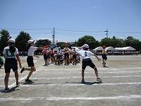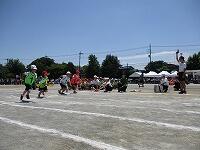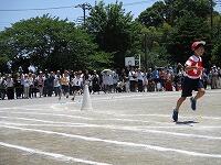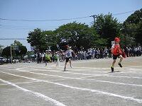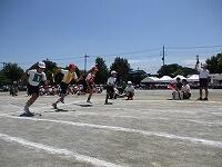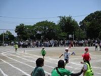 1年生も頑張って走っています。低学年は、「リングバトン」を使ってバトンパスです。