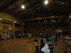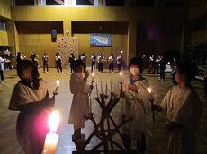 「キャンドルファイヤー」が始まりました。1組から入場して、みんなで「大きな輪」を作ります。進行は、「キャンプファイヤー実行委員」です。「遠き山に日は落ちて」を歌いながら、いよいよ入場です。続いて、「火の神」と「火の使い」の入場です。