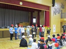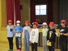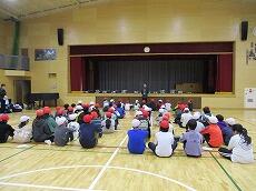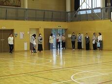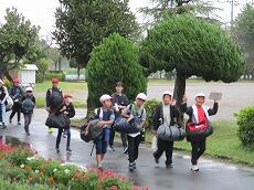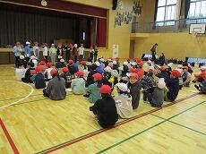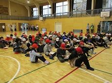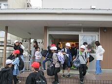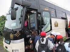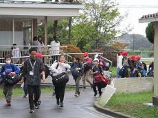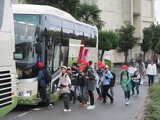 体育館で「出発の会」を終えて、バスの停まっている所まで歩きます。