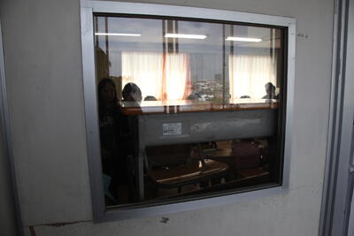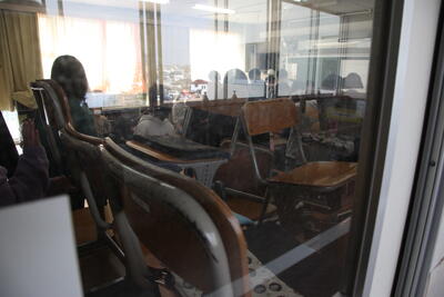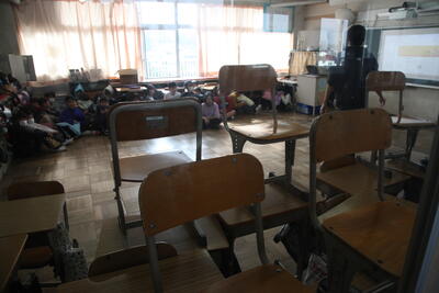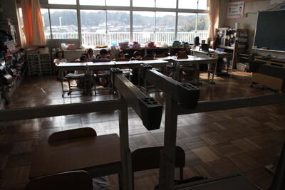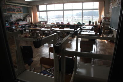 今日は、不審者が校内に侵入してきたという設定で、各クラスの入口にバリケードを設置する訓練です。