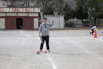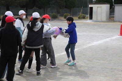 クラス対抗の風船リレーをしていました。風が強くて、風船が校庭の端まで飛ばされて
