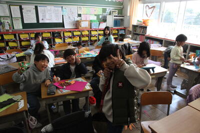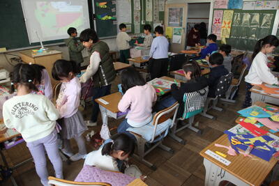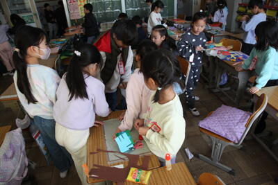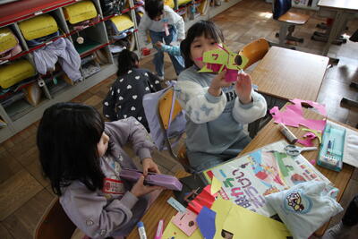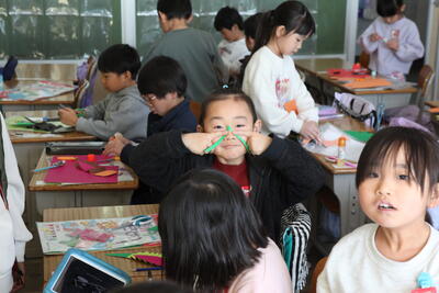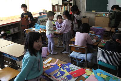 1年生が図工の時間に色紙を切って、動物や昆虫を立体的に作っていました。