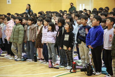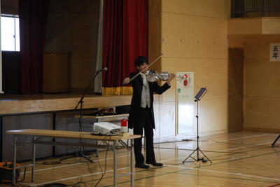 最後に校歌をバイオリンとピアノ伴奏で歌いました。全校朝会に比べ、いつもよりみんな元気な歌声でした。