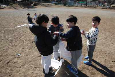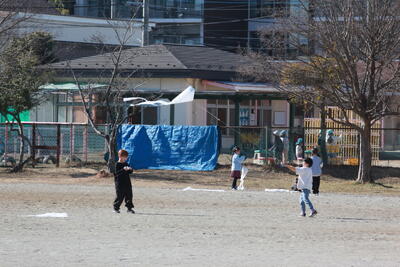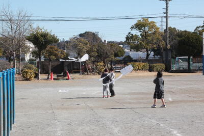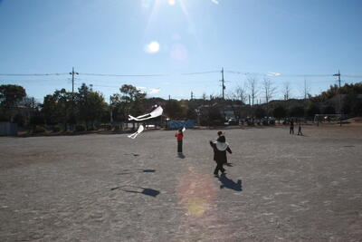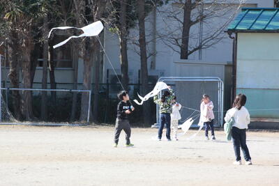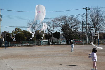 今日は、1年生が凧揚げを校庭で行いました。凧を飛ばすためには丁度良い風速でした。初めて凧揚げをした児童もいるようでした。広い校庭なので、どんな子も走り回って楽しそうでした。中には、絡まってしまい大変な状況になる子もいましたが、糸を切って解決したり、長い糸を協力して解いている子もいました。