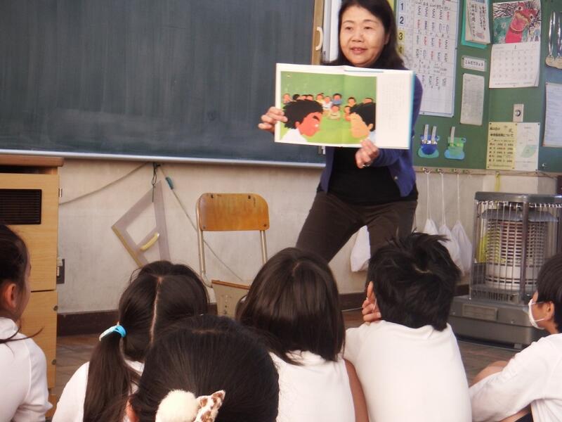 1月17日には, 去年まで図書館指導員だった清水先生に「てんぐわらい」という本の読み聞かせをしていただきました。子どもたちのにらめっこがおもしろくててんぐが空の上で笑うというお話に, 子どもたちは心惹かれたようです。