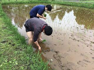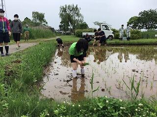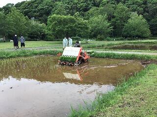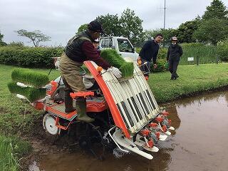 写真のように機械を使って田植えを行い,機械ができないところや細かいところを手で植えました。大人でも泥に足をとられて最初はなかなか上手にできませんでしたが,やっていくうちに上手に植えることができました。