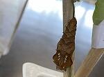 3枚目の写真は,前蛹という状態でだいたい1~3日くらい。この時,チョウの体の中で成虫になるための大変化が起きています。そして,幼虫からサナギへと最後の脱皮をし(これを蛹化といいます),最後の幼虫の皮を脱ぎ捨てて,新たにサナギへと体が大きく変化します。
