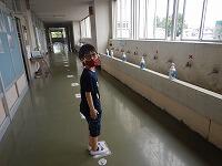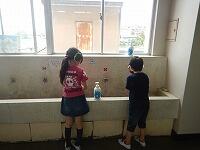 教室に入る前には,手洗いをします。密にならないように,流しには蛇口を1つおきに使うことを示した印や間隔をとって並ぶよう足型のラインを貼り出したり,洗剤を多く用意したりしました。