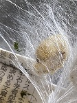 次の写真はトイレットペーパーの筒から抜けだし,虫かごの側面でマユを作ったカイコさんです。