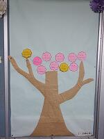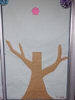 「50冊いったぜい!」と、5年生第1号のピンクの花を貼りに、Kさんが休み時間に来てくれました。Kさんは図書室常連さんです。今年は図書委員もやってくれていて、お手伝いもたくさんしてくれます。ありがとう!太陽のような、面白いところに貼りましたね。