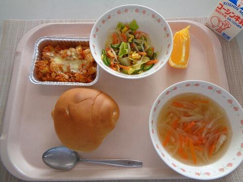 牛乳 テーブルロール じゃがいものミートグラタン コーンサラダ 千切り野菜スープ ネーブルオレンジ
