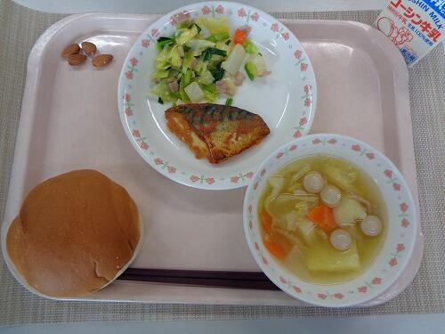 牛乳 テーブルロール タンドリー鯖 かぶとベーコンのサラダ キャベツとポテトのスープ アーモンド