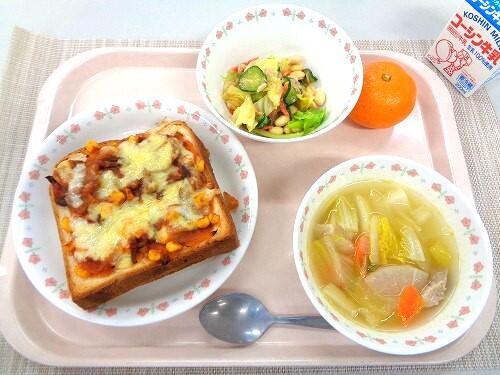 牛乳 ピザトースト ポトフ ツナと大豆のサラダ みかん