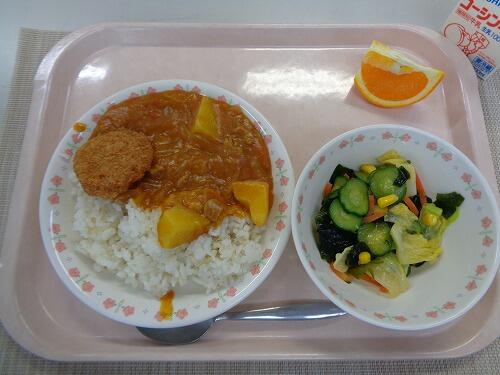 牛乳 カツカレーライス わかめとコーンのサラダ かんきつ果物(清見)