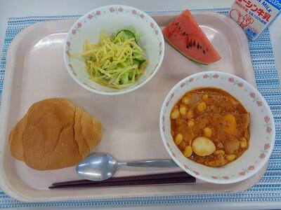 牛乳 テーブルロール 鶏肉と大豆のケチャップ煮 揚げじゃがサラダ 小玉すいか