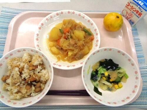 牛乳 秋刀魚ごはん にくじゃが こんにゃくサラダ みかん