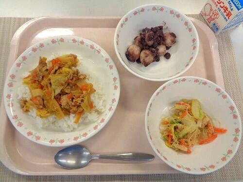 牛乳 肉野菜丼 白菜のサラダ 白玉小豆
