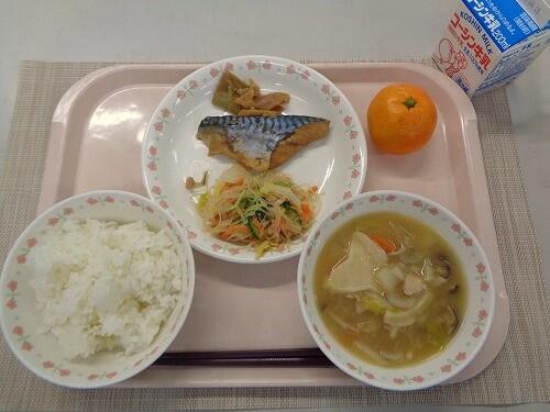 牛乳 ごはん 鯖のみそ煮 白菜のサラダ せんべい汁 みかん