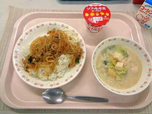 牛乳 ごはん 春雨のオイスター炒め 豆乳チゲスープ ヨーグルト