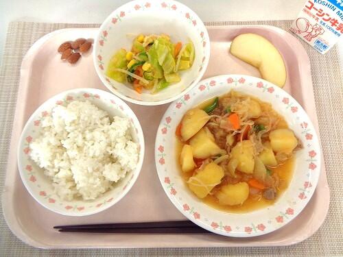 牛乳 ごはん 肉じゃが 人参ドレッシングサラダ りんご アーモンド