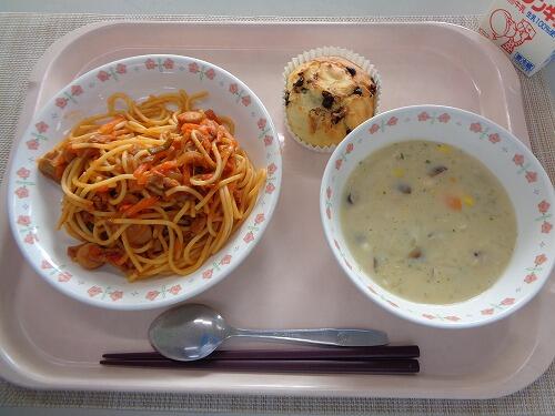 牛乳 スパゲティナポリタン コーンクリームスープ チョコチップケーキ