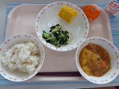 牛乳 ごはん にくじゃが すみそあえ ゆでとうもろこし 冷凍みかん