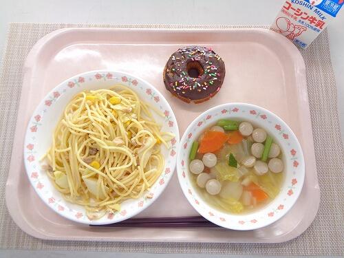 牛乳 キャベツのペペロンチーノ かぶと白菜のスープ チョコ付きドーナツ
