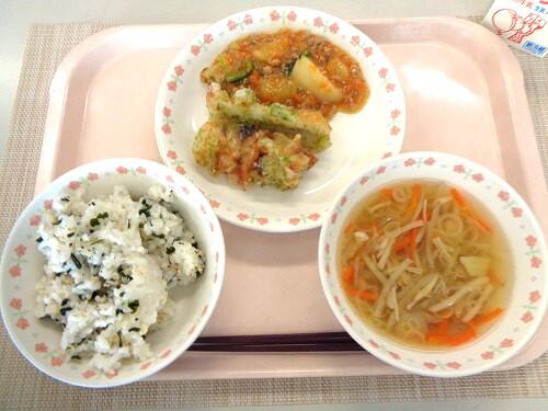 牛乳 わかめごはん ちくわのいそべあげ かぶと大根のそぼろ煮 沢煮椀