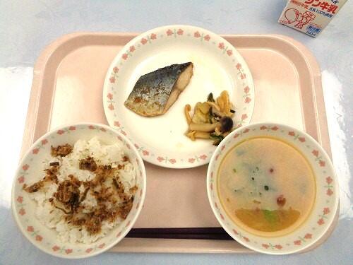 牛乳 ごはん だしふりかけ 魚のにんにくしょうゆ焼き 煮びたし なめことおろしのみそ汁