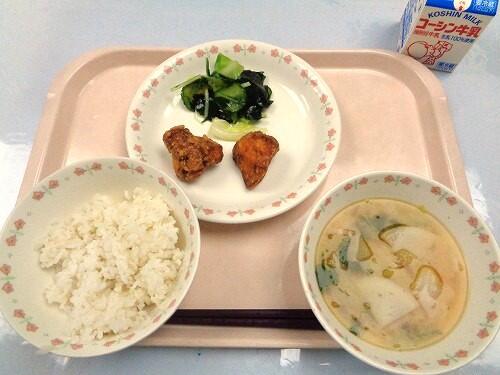 牛乳 ごはん 鶏肉のからあげ わかめの和風和え かぶとベーコンのみそ汁