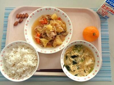 牛乳 ごはん 肉じゃが かんぴょうのかきたま汁 みかん アーモンド