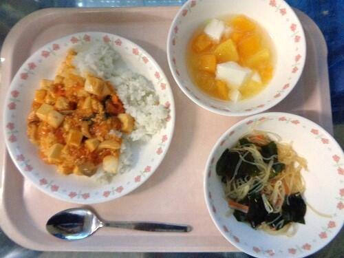 牛乳 ごはん 豆腐のチリソース煮 春雨サラダ フルーツ杏仁豆腐